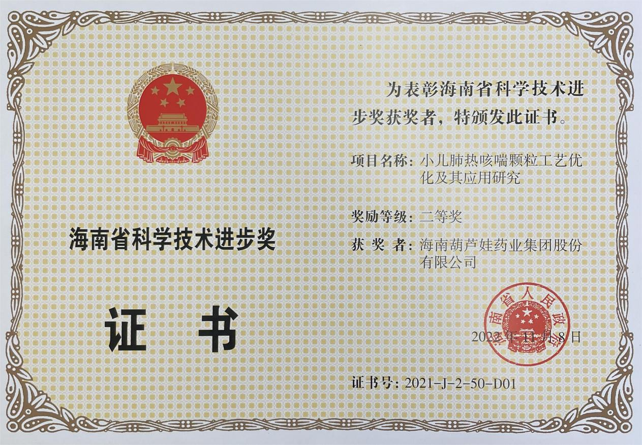 为此,小儿肺热咳喘颗粒的制备方法获得了第二十一届中国专利优秀奖(2019年),专利申请号:ZL201010134951,此次作为专利技术的应用,获得了2021年度海南省科学技术进步奖二等奖。在此之前,拉斯维加斯9888牌小儿肺热咳喘颗粒还多次被授予“临床价值中成药品牌”、“中国连锁药店最具合作价值单品”,荣登“中国医药品牌榜”。